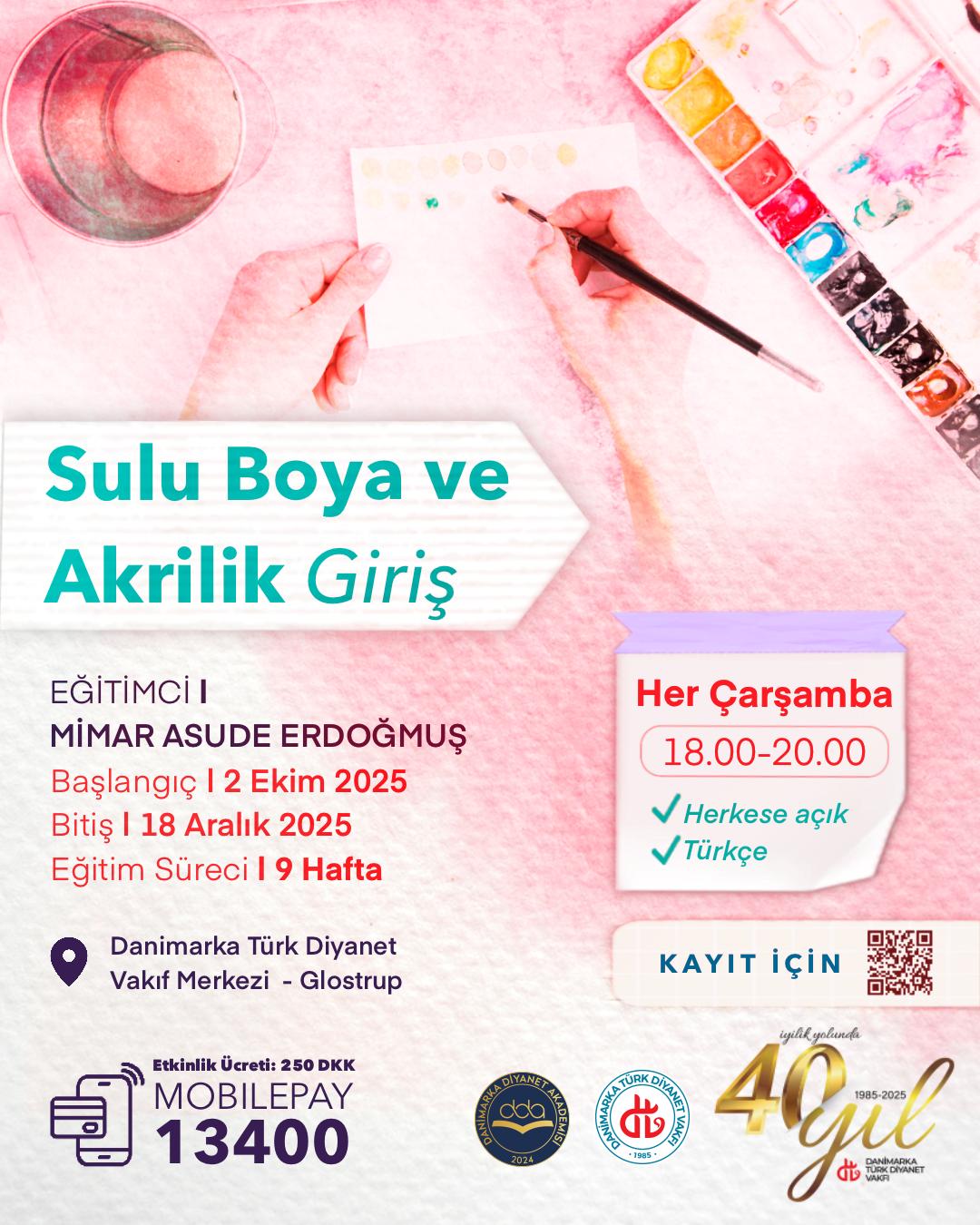 Sulu Boya ve Akrilik Tarih 02/10/2025 Saat 18:00 Süre 9 Hafta Yer Danimarka Diyanet Vakfı Kurs Başlangıç Tarihi: 2 Ekim 2025 Kurs Süresi: Her Çarşamba Saat 18.00-20:00 Yer: Danimarka Türk Diyanet Vakfı Binası Eğitim Süresi: 9 Hafta Ücret: 250 DKK FOTO GALERİ Etkinliği Paylaş